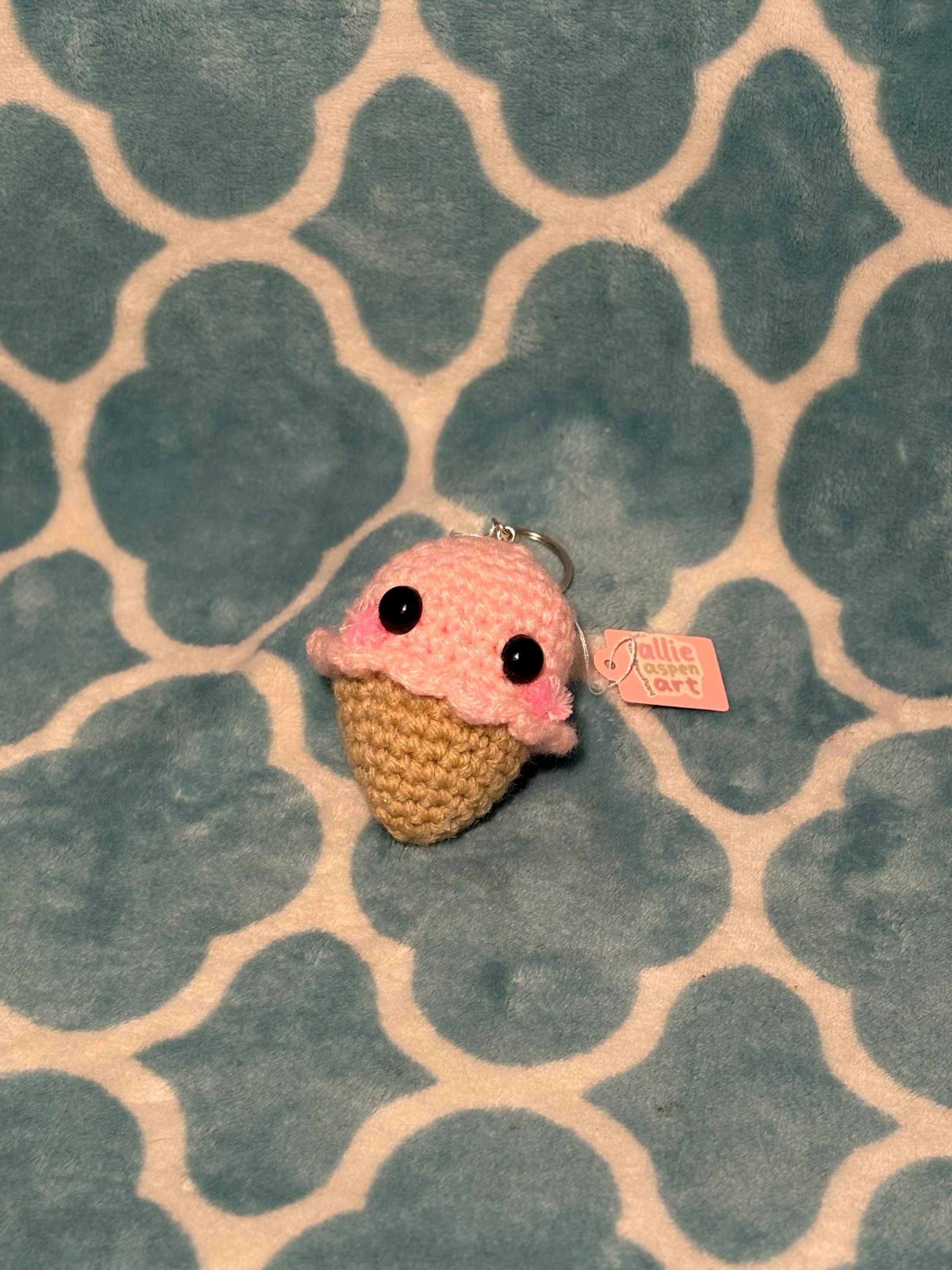 I crocheted this strawberry ice cream cone. He’s got rosy pink cheeks and a keychain attached so he can always be by your side.